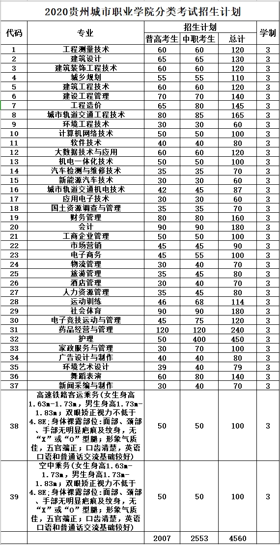 贵州城市职业学院2020年分类考试招生计划
