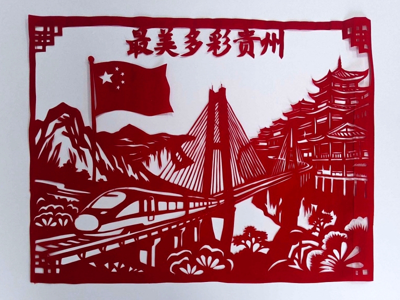 “曾以为竞赛的荣誉触手可及,直到亲身投入一场场项目比拼,才知晓其中的分量。”通过各种比赛的层层磨砺,刘国萍对“工匠精神”有了更为真切与深刻的理解。职业教育所倡导的动手实干,在她手中内化为一程沉心静气的修行——每一幅作品的诞生,都贯穿了从构思、绘稿到试刻、修整的完整循环,急躁不得。这份从实践中滋养出的专注与耐心,也自然地流淌向了她所生长的土地。在“最美多彩贵州”系列中,银剪游走,让疾驰的高铁与静默的侗家鼓楼在红纸上相遇,现代成就与民族记忆在阴刻阳刻的虚实之间彼此映照、交融共生。这不仅是技能的展示,更是一份从技艺深处生长出来的文化自觉与乡土情怀。