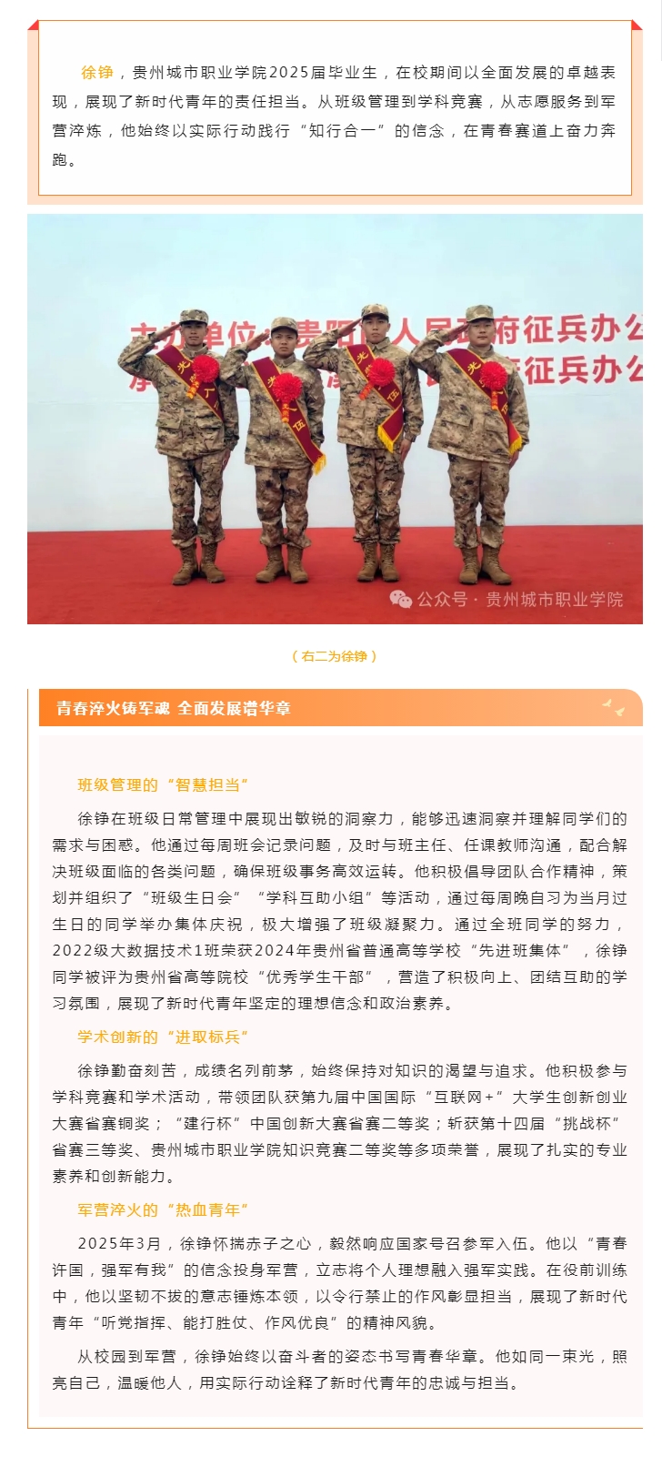 《职教出彩·校友风采录|从贵州城市职业学院走出的行业“追光者”》青春淬火铸军魂 全面发展谱华章——大数据学院优秀毕业生徐铮