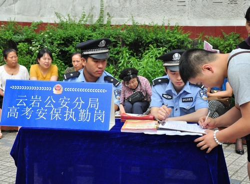 所有考场悬挂电子挂钟,考生不能带手表入场考试 各部门协同配合、保障有力,考试平稳安全实施 在试卷运送、保管过程中,全省保密、纪检监察、公安、武警部门全程参与,全力配合招生考试部门做好试卷安全保密工作,保证了高考试卷的绝对安全。试卷进入保密室后,实行公安(武警)、保密、监察、招生四部门人员24小时值班,启用“国家教育考试试卷保密室网上巡查系统”,实行教育部、省、市、县招生考试机构四级联网,24小时网上巡查。 公安部门加大警力,加强高考安全保卫工作,考试期间加强考点周边治安管理和巡逻力度,加强对网上不良信息的监控和打击,及时排除各种可能影响考试安全的因素,切实保障高考安全进行。工商部门在全省开展高考期间考试环境专项整治行动,开展校园周边环境专项整治行动,严厉打击贩卖考试作弊器材、发布虚假广告、销售不合格食品等违法行为。气象部门专门制定服务方案,及时向招生考试及相关部门发送天气预报和预警,为各部门及时采取措施,确保高考安全顺利进行提供了有力的支持…… 全省各级招委、教育、宣传、公安、国安、监察、工商、保密、武警、通信、无线电管理、气象等多部门通力协作,保障我省高考安全、顺利实施。