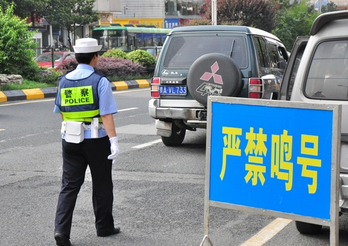 交警在考点外的道路上执勤并设置“禁止鸣号”标识